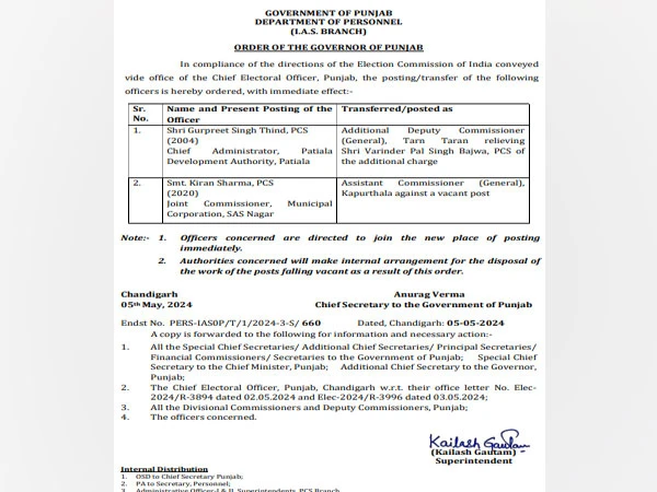 ਚੰਡੀਗੜ੍ਹ, 6 ਮਈ- 2 ਪੀ.ਸੀ.ਐੱਸ. ਅਧਿਕਾਰੀ ਗੁਰਪ੍ਰੀਤ ਸਿੰਘ ਠੰਢ ਤੇ ਕਿਰਨ ਸ਼ਰਮਾ ਦਾ ਤਬਾਦਲਾ ਕੀਤਾ ਗਿਆ ਹੈ ।