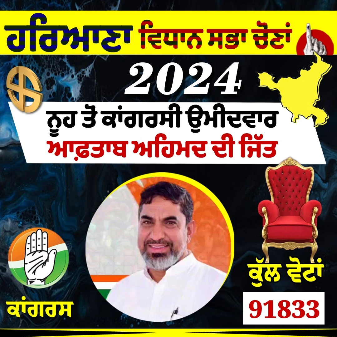 ਹਰਿਆਣਾ, 8 ਅਕਤੂਬਰ- ਹਰਿਆਣਾ ਦੇ ਵਿਧਾਨ ਸਭਾ ਹਲਕਾ ਨੂਹ ਵਿਖੇ ਕਾਂਗਰਸ ਦੇ ਉਮੀਦਵਾਰ ਆਫ਼ਤਾਬ ਅਹਿਮਦ ਨੇ ਜਿੱਤ ਦਰਜ ਕਰ ਲਈ ਹੈ। ਉਨ੍ਹਾਂ ਨੂੰ 91833 ਵੋਟਾਂ ਮਿਲੀਆਂ ਹਨ। ਇਨੈਲੋ ਦੇ ਉਮੀਦਵਾਰ ਤਾਹਿਰ ਹੁਸੈਨ ਦੂਜੇ ਨੰਬਰ ’ਤੇ ਰਹੇ ਅਤੇ ਭਾਜਪਾ ਉਮੀਦਵਾਰ ਸੰਜੇ ਸਿੰਘ 15902 ਵੋਟਾਂ ਹਾਸਲ ਕਰ ਤੀਜੇ ਸਥਾਨ ’ਤੇ ਰਹੇ ਹਨ।